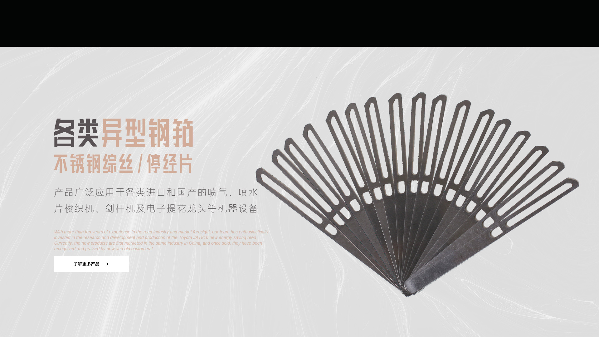 憑借十多年鋼筘行業(yè)經(jīng)驗及對市場的前瞻性,我們團隊滿懷熱情的投入到豐田JAT810新型節(jié)能鋼筘的研發(fā)和生產(chǎn)當(dāng)中,目前新產(chǎn)品在國內(nèi)同行業(yè)中先行上市銷售,一經(jīng)銷售就得到了新老客戶的認(rèn)可和好評!